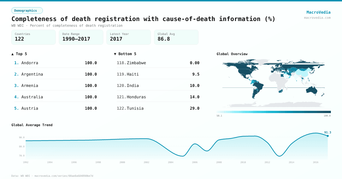 DemographicsWB WDIwb_wdi:SP.REG.DTHS.ZS•Percent of completeness of death registration•1990 → 2017•122 countries