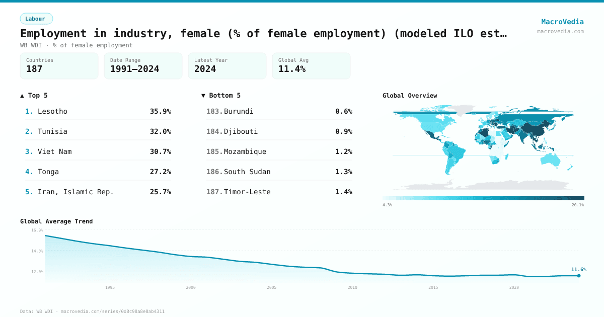 LabourWB WDIwb_wdi:SL.IND.EMPL.FE.ZS•% of female employment•1991 → 2024•187 countries