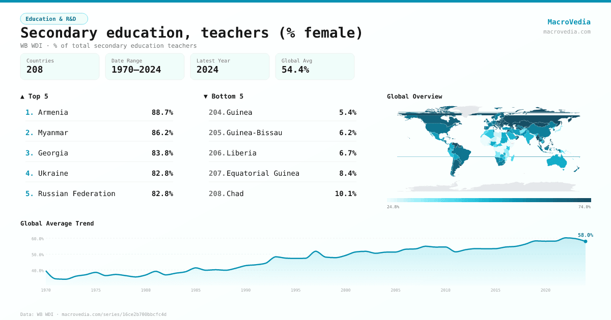 Education & R&DWB WDIwb_wdi:SE.SEC.TCHR.FE.ZS•% of total secondary education teachers•1970 → 2024•208 countries