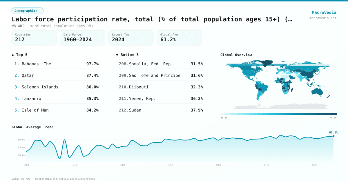 Labor force participation rate, total (% of total population ages 15+) (national estimate) by country
