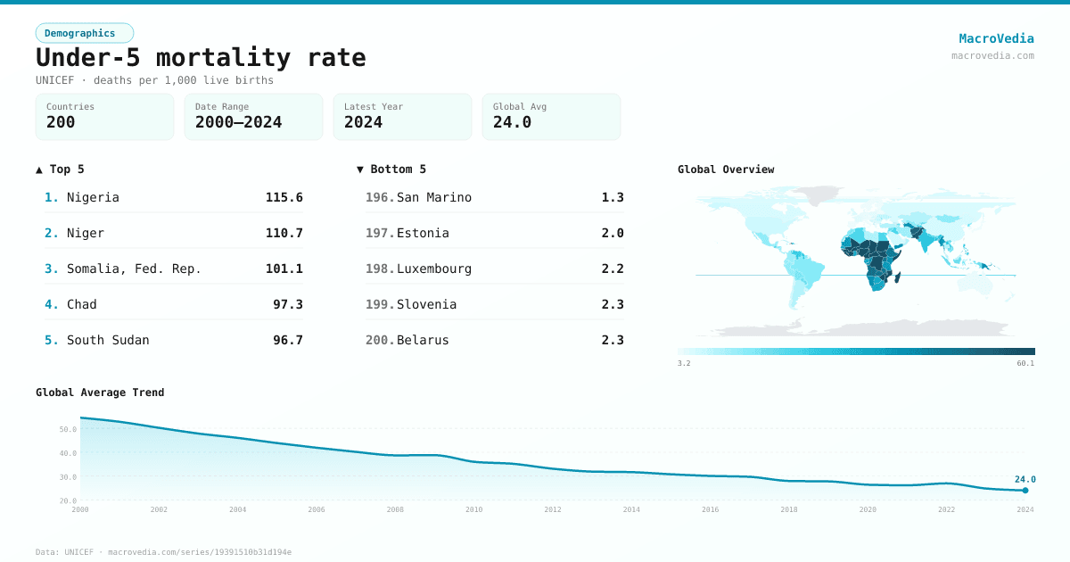 DemographicsUNICEFunicef_sowc:CME_MRY0T4•deaths per 1,000 live births•2000 → 2024•198 countries