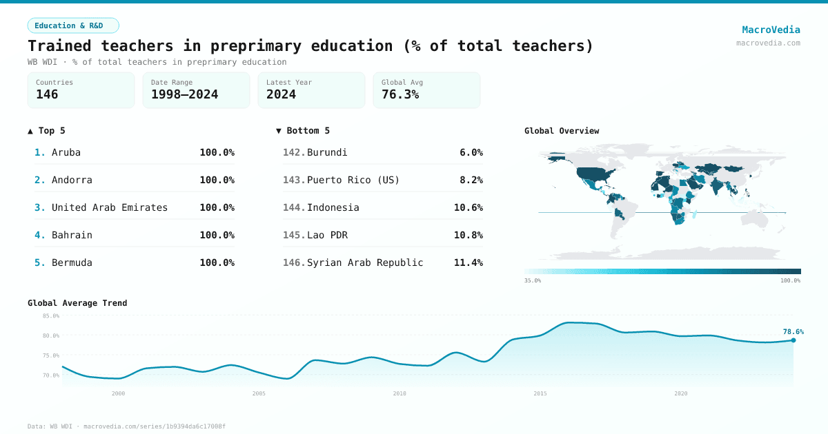 Education & R&DWB WDIwb_wdi:SE.PRE.TCAQ.ZS•% of total teachers in preprimary education•1998 → 2024•146 countries