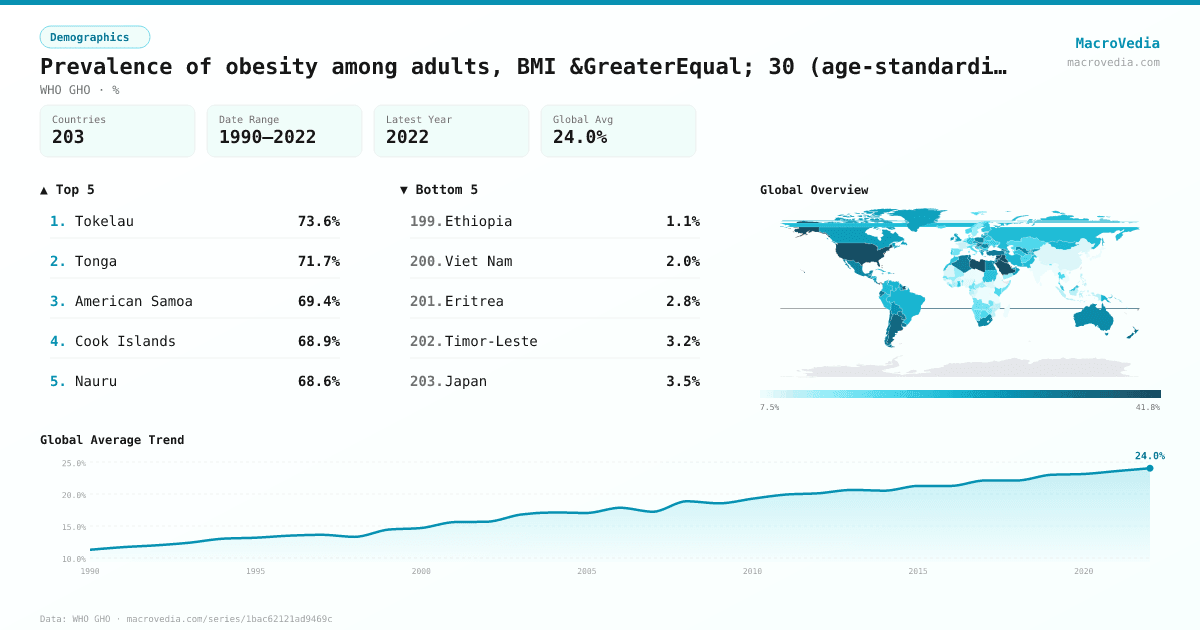 DemographicsWHO GHOwho_gho:NCD_BMI_30A•%•1990 → 2022•196 countries