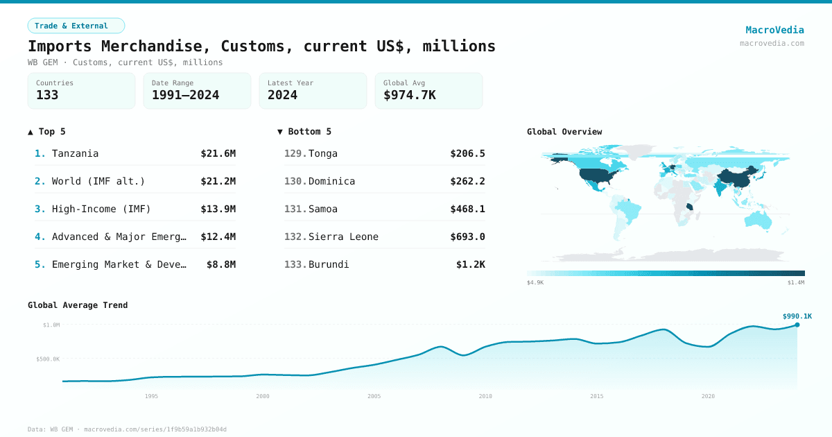 Trade & ExternalWB GEMwb_gem:DMGSRMRCHNSCD•Customs, current US$, millions•1991 → 2024•118 countries