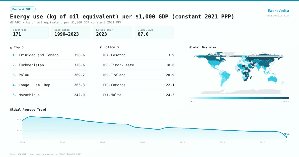 | Trinidad and TobagoTTO | 358.57 kg of oil equivalent per $1,000 GDP constant 2021 PPP | 2022 | |
