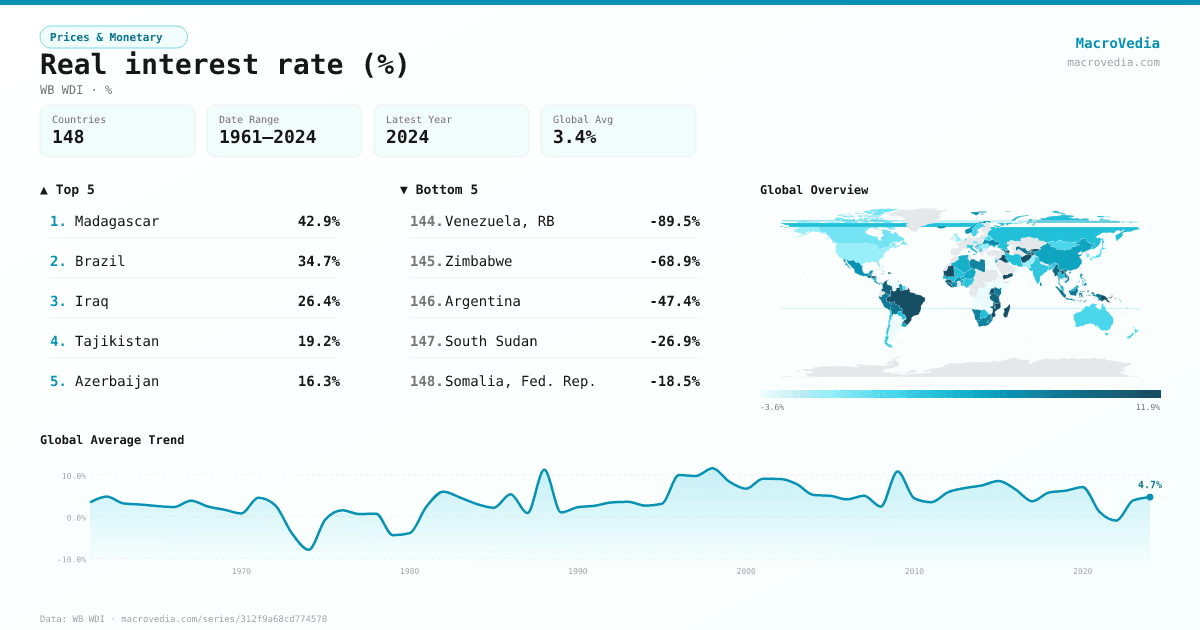 Prices & MonetaryWB WDIwb_wdi:FR.INR.RINR•%•1961 → 2024•148 countries