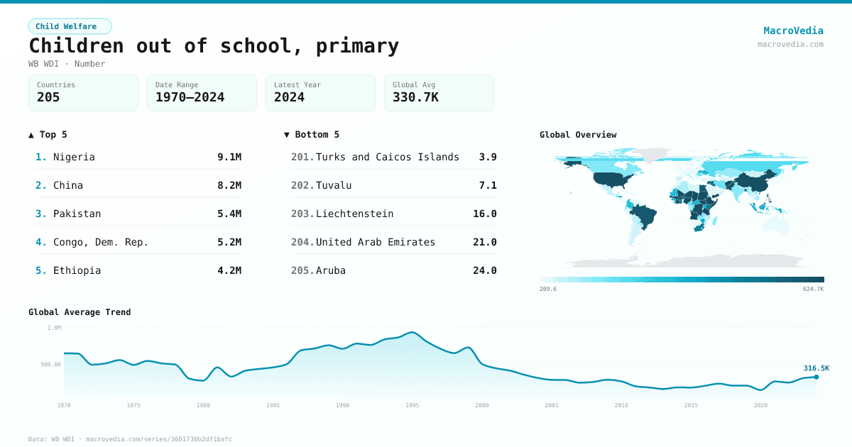 Child WelfareWB WDIwb_wdi:SE.PRM.UNER•Number•1970 → 2024•205 countries