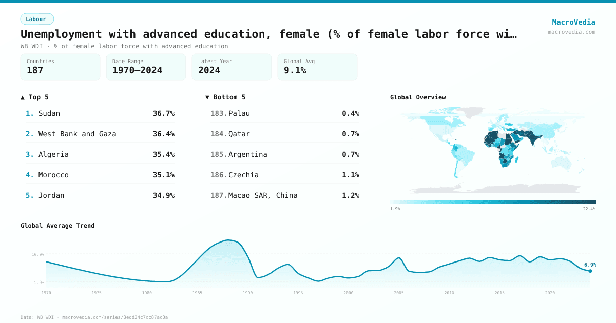 LabourWB WDIwb_wdi:SL.UEM.ADVN.FE.ZS•% of female labor force with advanced education•1970 → 2024•187 countries