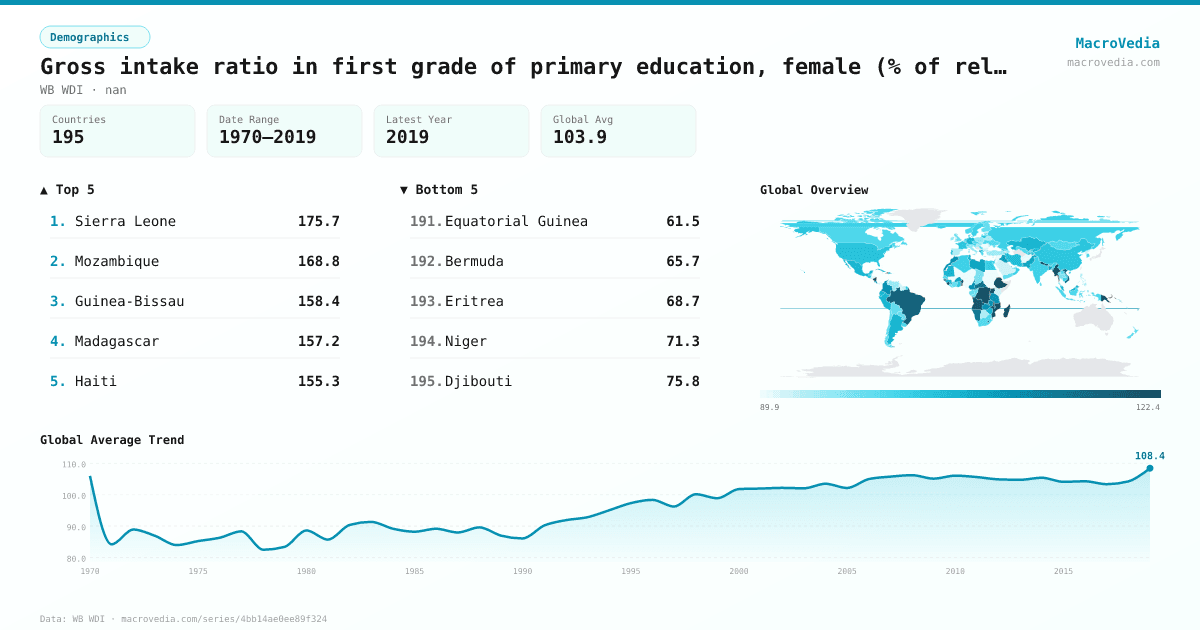 Gross intake ratio in first grade of primary education, female (% of relevant age group) by country