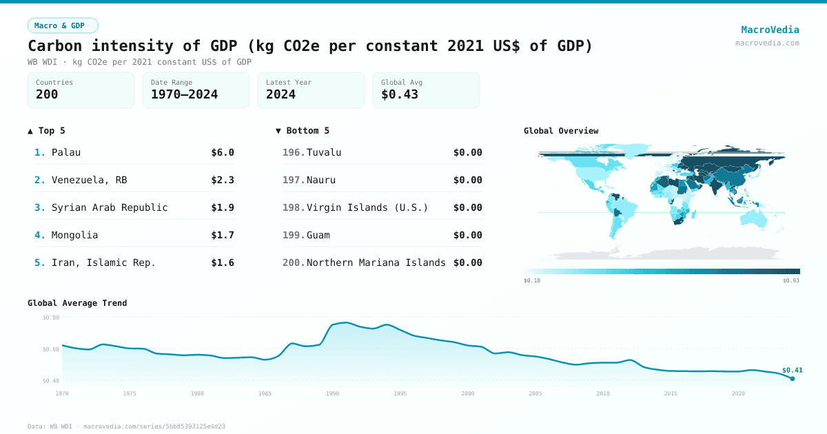 Macro & GDPWB WDIwb_wdi:EN.GHG.CO2.RT.GDP.KD•kg CO2e per 2021 constant US$ of GDP•1970 → 2024•200 countries