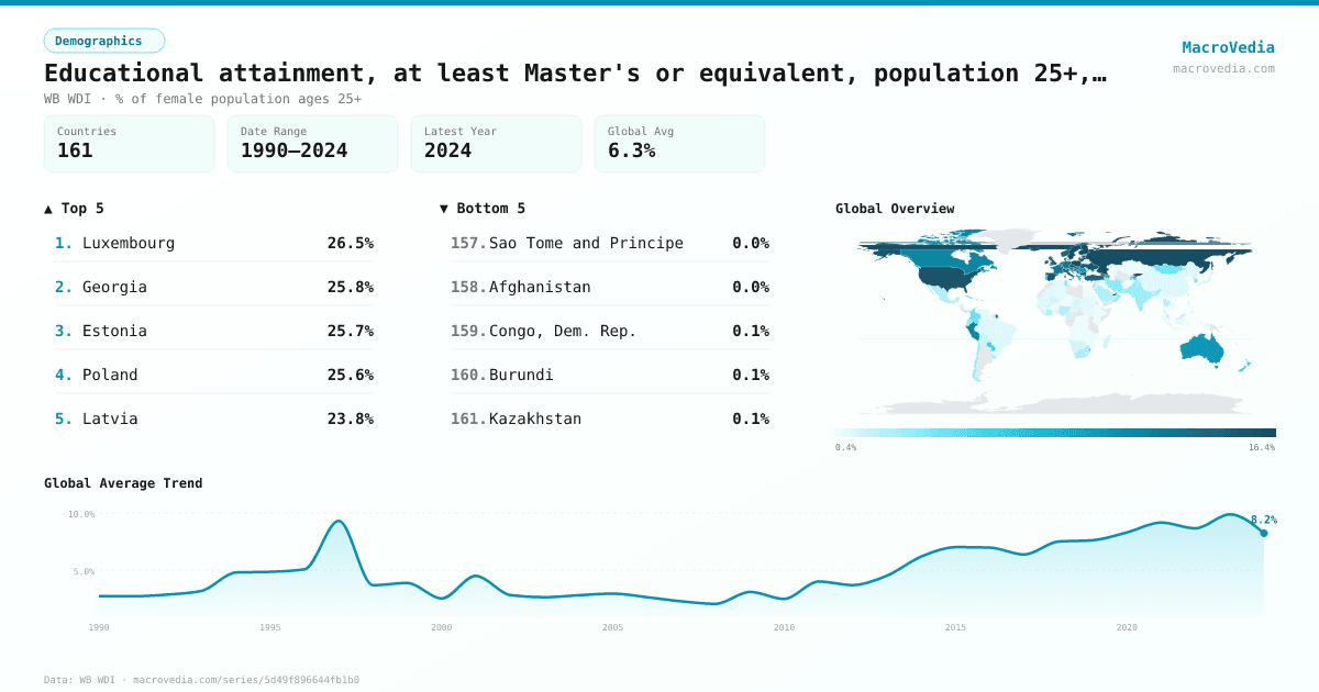 DemographicsWB WDIwb_wdi:SE.TER.CUAT.MS.FE.ZS•% of female population ages 25+•1990 → 2024•161 countries