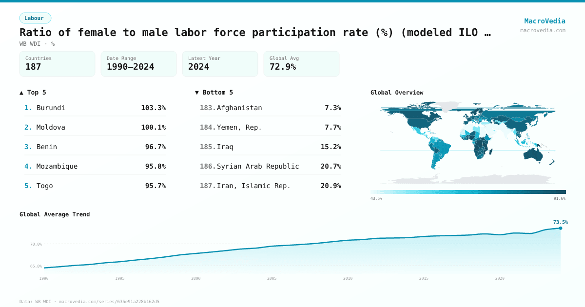 Ratio of female to male labor force participation rate (%) (modeled ILO estimate) by country
