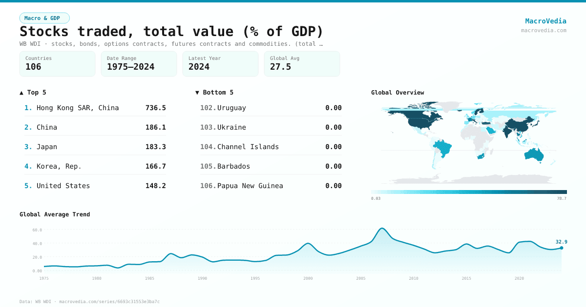 Macro & GDPWB WDIwb_wdi:CM.MKT.TRAD.GD.ZS•stocks, bonds, options contracts, futures contracts and commodities. (total number of shares traded, both domestic and foreign, multiplied by respective prices)•1975 → 2024•106 countries
