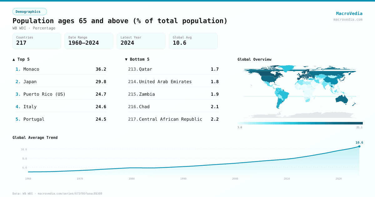 DemographicsWB WDIwb_wdi:SP.POP.65UP.TO.ZS•Percentage•1960 → 2024•217 countries