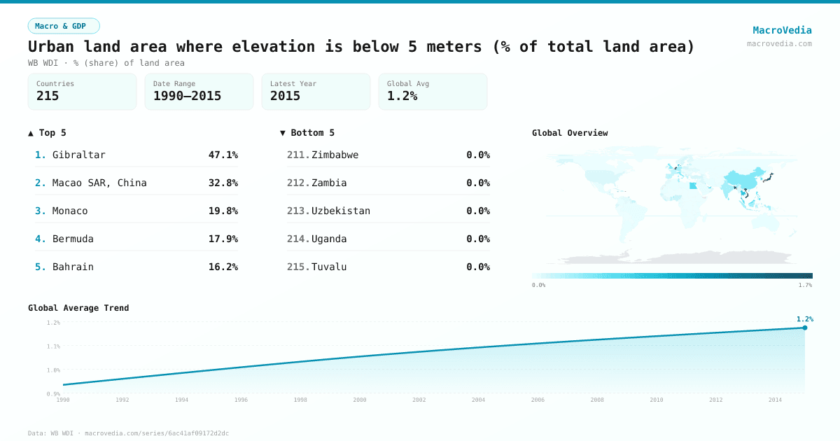 Urban land area where elevation is below 5 meters (% of total land area) by country