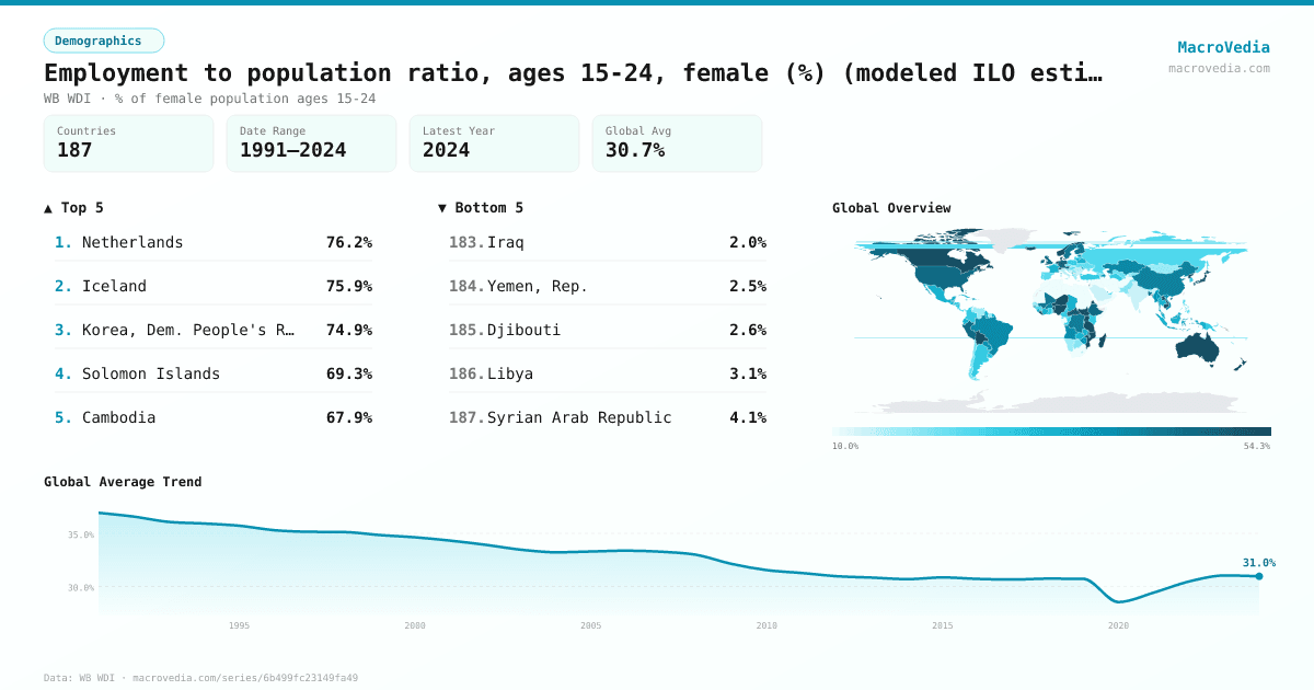 DemographicsWB WDIwb_wdi:SL.EMP.1524.SP.FE.ZS•% of female population ages 15-24•1991 → 2024•187 countries