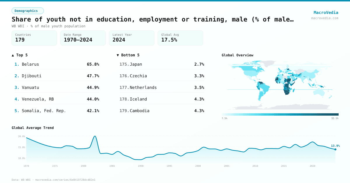 DemographicsWB WDIwb_wdi:SL.UEM.NEET.MA.ZS•% of male youth population•1970 → 2024•179 countries