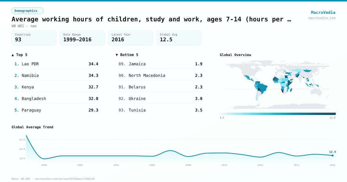 Average working hours of children, study and work, ages 7-14 (hours per week) by country