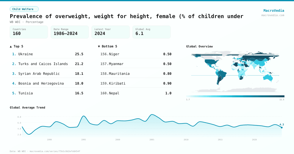 Prevalence of overweight, weight for height, female (% of children under by country
