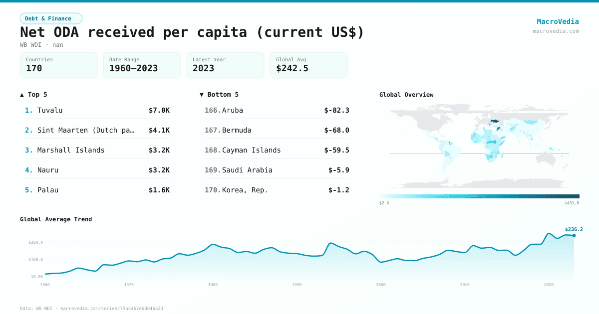 Debt & FinanceWB WDIwb_wdi:DT.ODA.ODAT.PC.ZS•nan•1960 → 2023•170 countries