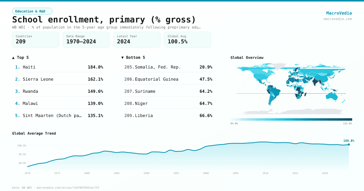 Education & R&DWB WDIwb_wdi:SE.PRM.ENRR•% of population in the 5-year age group immediately following preprimary education•1970 → 2024•209 countries