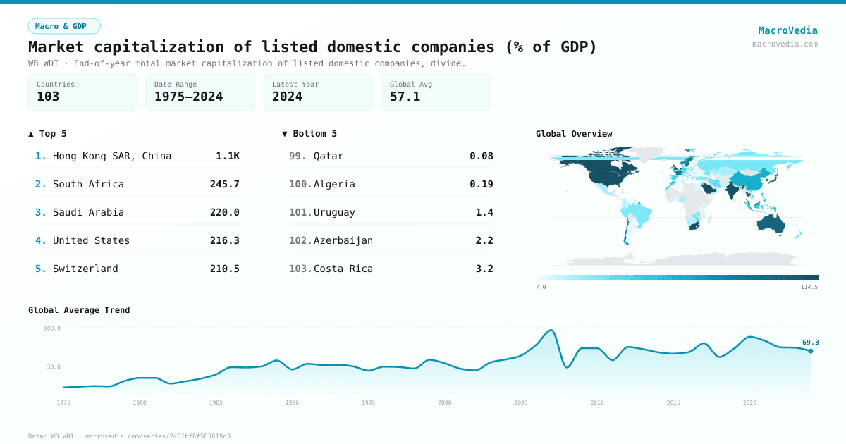 Macro & GDPWB WDIwb_wdi:CM.MKT.LCAP.GD.ZS•End-of-year total market capitalization of listed domestic companies, divided by gross domestic product, expressed as a percentage.•1975 → 2024•103 countries