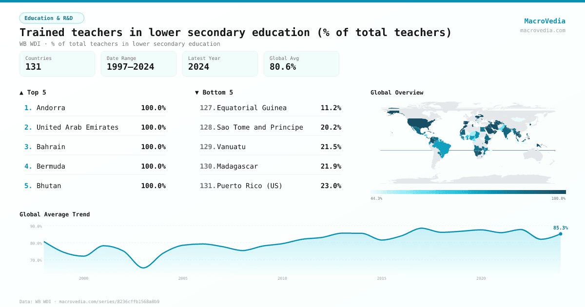 Education & R&DWB WDIwb_wdi:SE.SEC.TCAQ.LO.ZS•% of total teachers in lower secondary education•1997 → 2024•131 countries