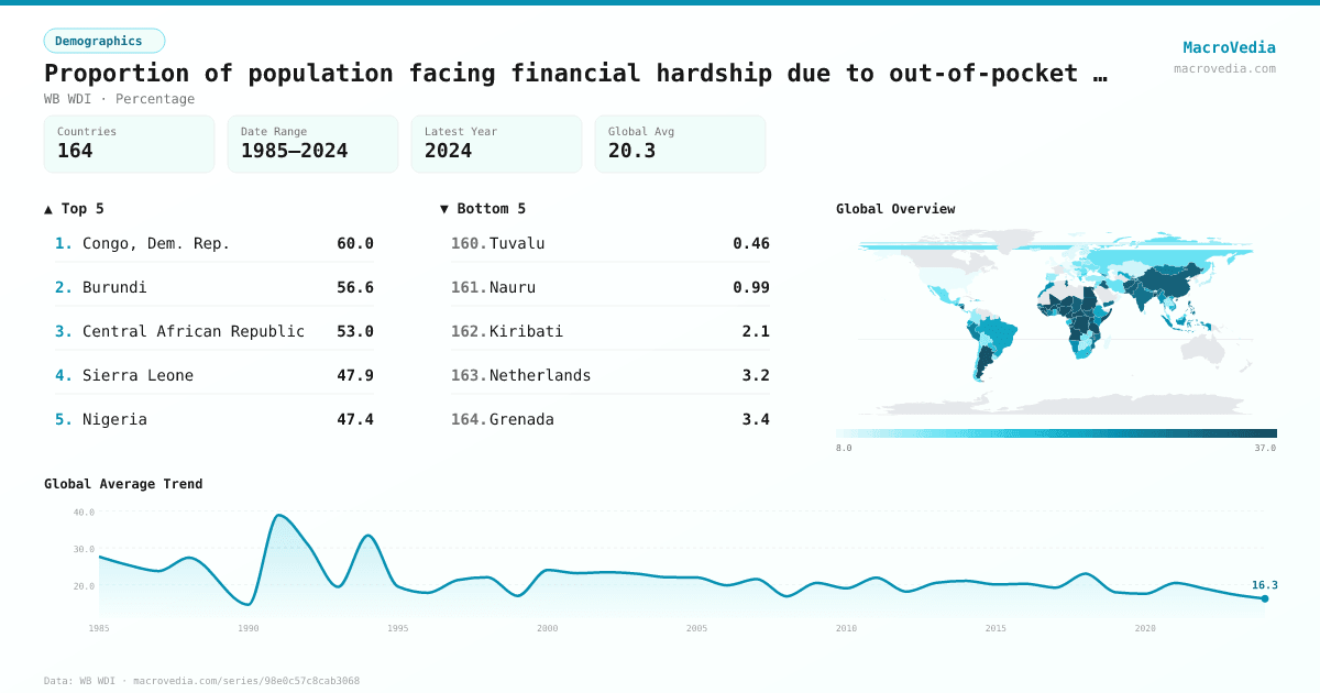 Proportion of population facing financial hardship due to out-of-pocket health expenditure (%) by country