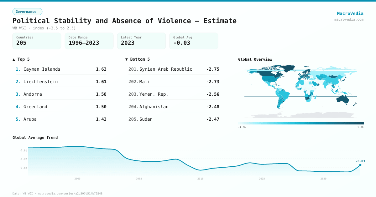 GovernanceWB WGIwb_wgi:PV.EST•index (-2.5 to 2.5)•1996 → 2023•205 countries