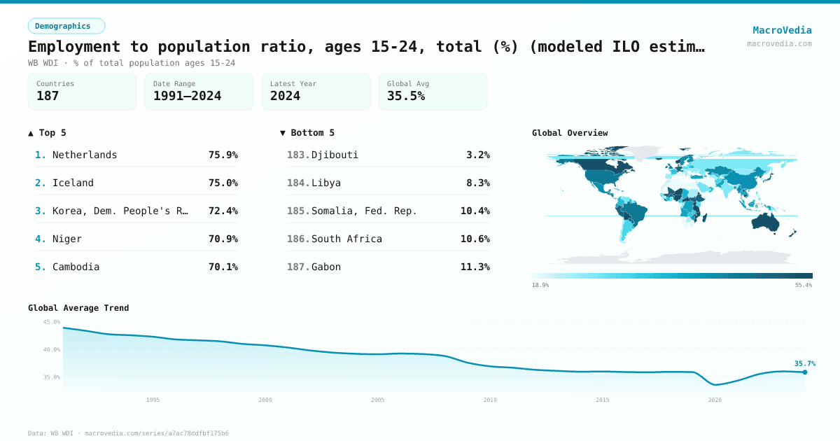 DemographicsWB WDIwb_wdi:SL.EMP.1524.SP.ZS•% of total population ages 15-24•1991 → 2024•187 countries