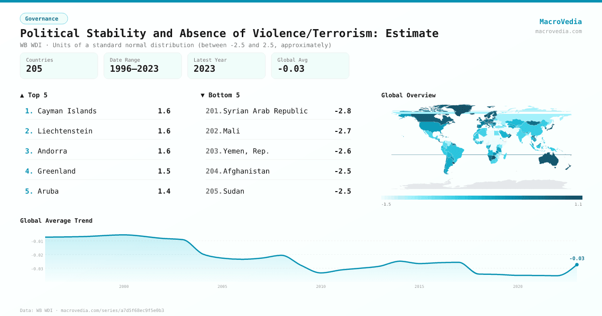 GovernanceWB WDIwb_wdi:PV.EST•Units of a standard normal distribution (between -2.5 and 2.5, approximately)•1996 → 2023•205 countries