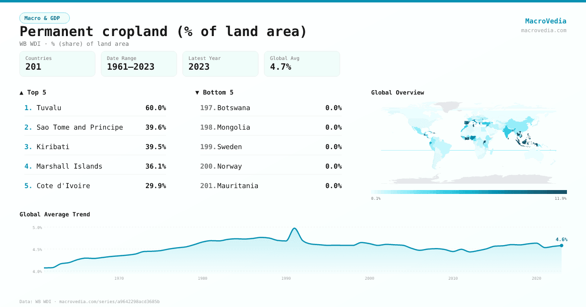 Macro & GDPWB WDIwb_wdi:AG.LND.CROP.ZS•% (share) of land area•1961 → 2023•201 countries