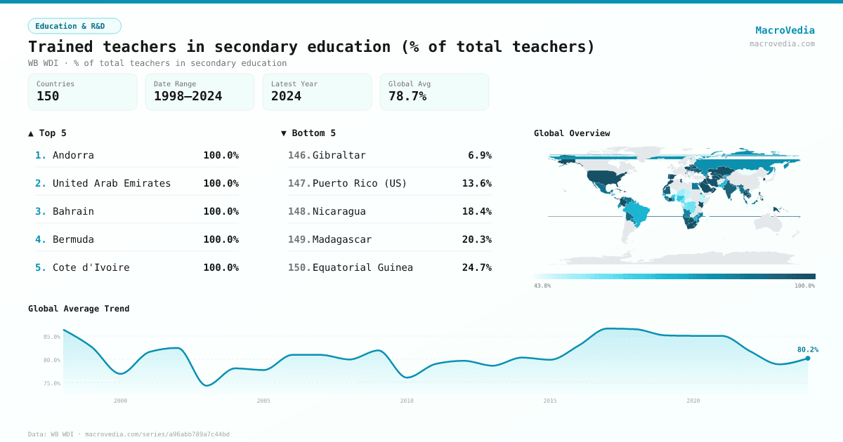 Education & R&DWB WDIwb_wdi:SE.SEC.TCAQ.ZS•% of total teachers in secondary education•1998 → 2024•150 countries