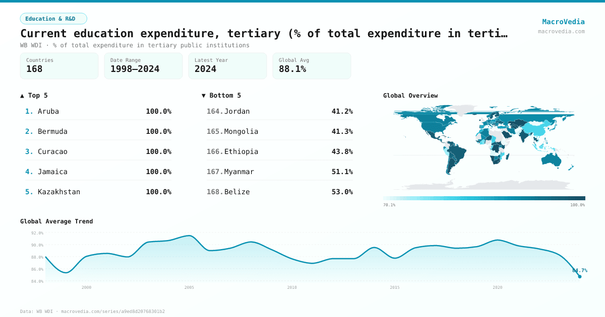 Education & R&DWB WDIwb_wdi:SE.XPD.CTER.ZS•% of total expenditure in tertiary public institutions•1998 → 2024•168 countries