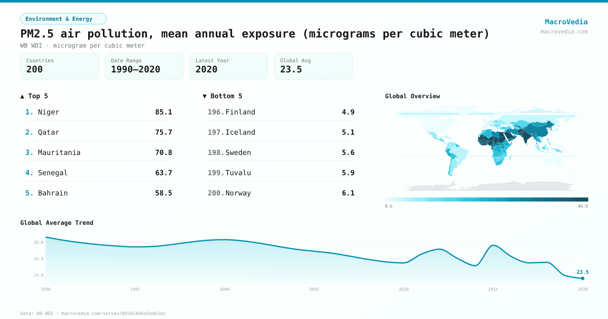 Environment & EnergyWB WDIwb_wdi:EN.ATM.PM25.MC.M3•microgram per cubic meter•1990 → 2020•200 countries