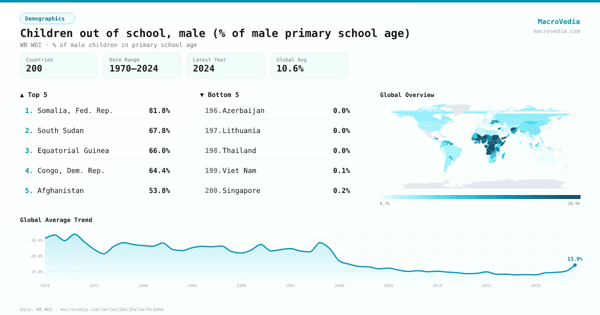 DemographicsWB WDIwb_wdi:SE.PRM.UNER.MA.ZS•% of male children in primary school age•1970 → 2024•200 countries