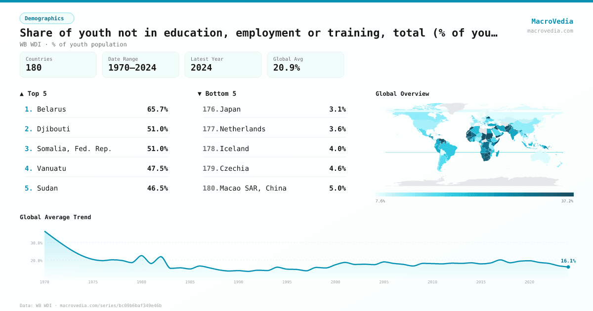 DemographicsWB WDIwb_wdi:SL.UEM.NEET.ZS•% of youth population•1970 → 2024•180 countries