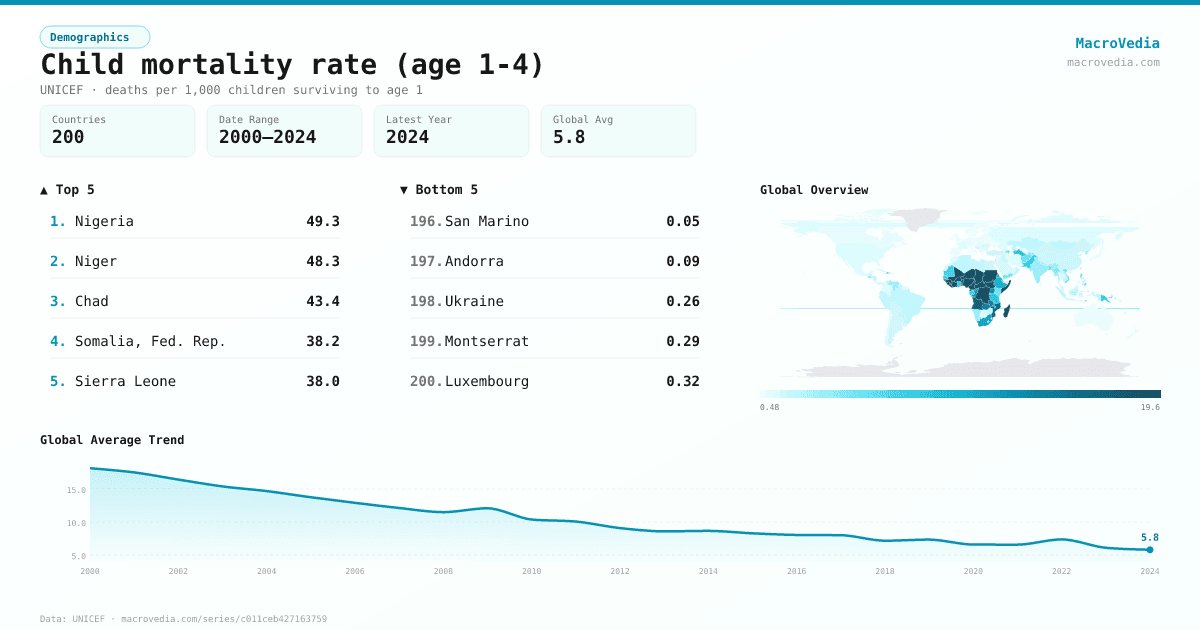 | NigeriaNGA | 49.32 deaths per 1,000 children surviving to age 1 | 2024 | |