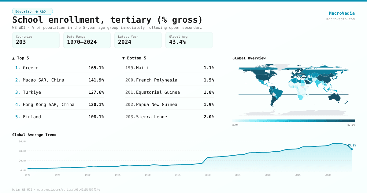 Education & R&DWB WDIwb_wdi:SE.TER.ENRR•% of population in the 5-year age group immediately following upper secondary education•1970 → 2024•203 countries