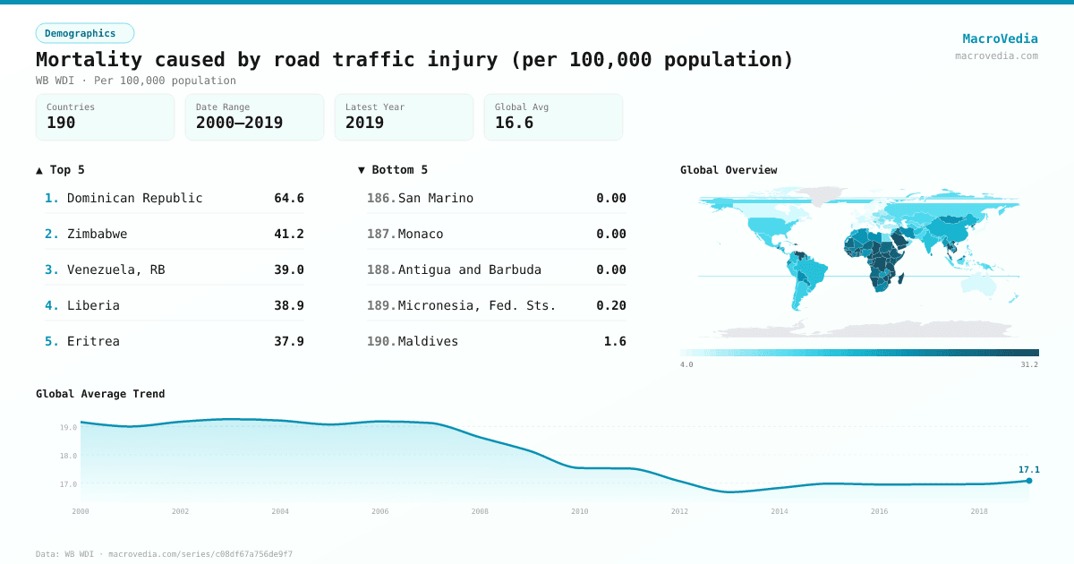 Mortality caused by road traffic injury (per 100,000 population) by country