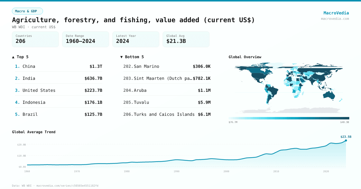 Macro & GDPWB WDIwb_wdi:NV.AGR.TOTL.CD•current US$•1960 → 2024•206 countries