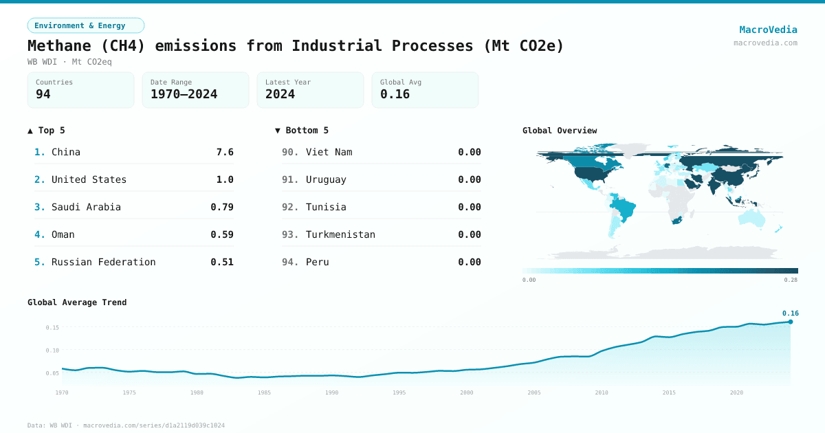 Environment & EnergyWB WDIwb_wdi:EN.GHG.CH4.IP.MT.CE.AR5•Mt CO2eq•1970 → 2024•94 countries