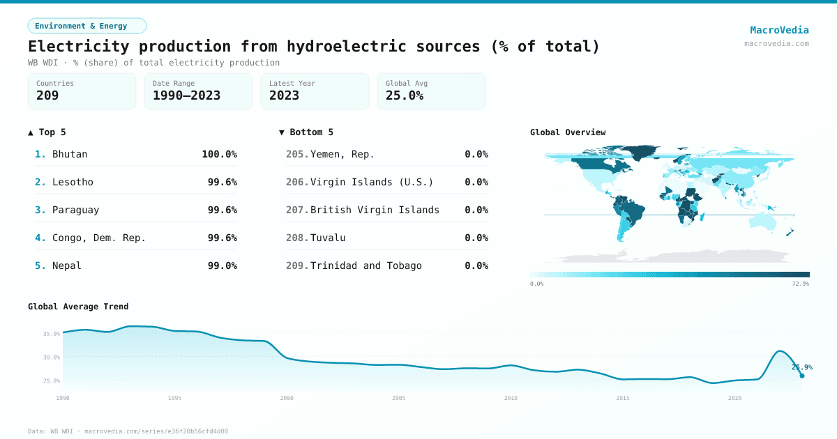 Environment & EnergyWB WDIwb_wdi:EG.ELC.HYRO.ZS•% (share) of total electricity production•1990 → 2023•209 countries