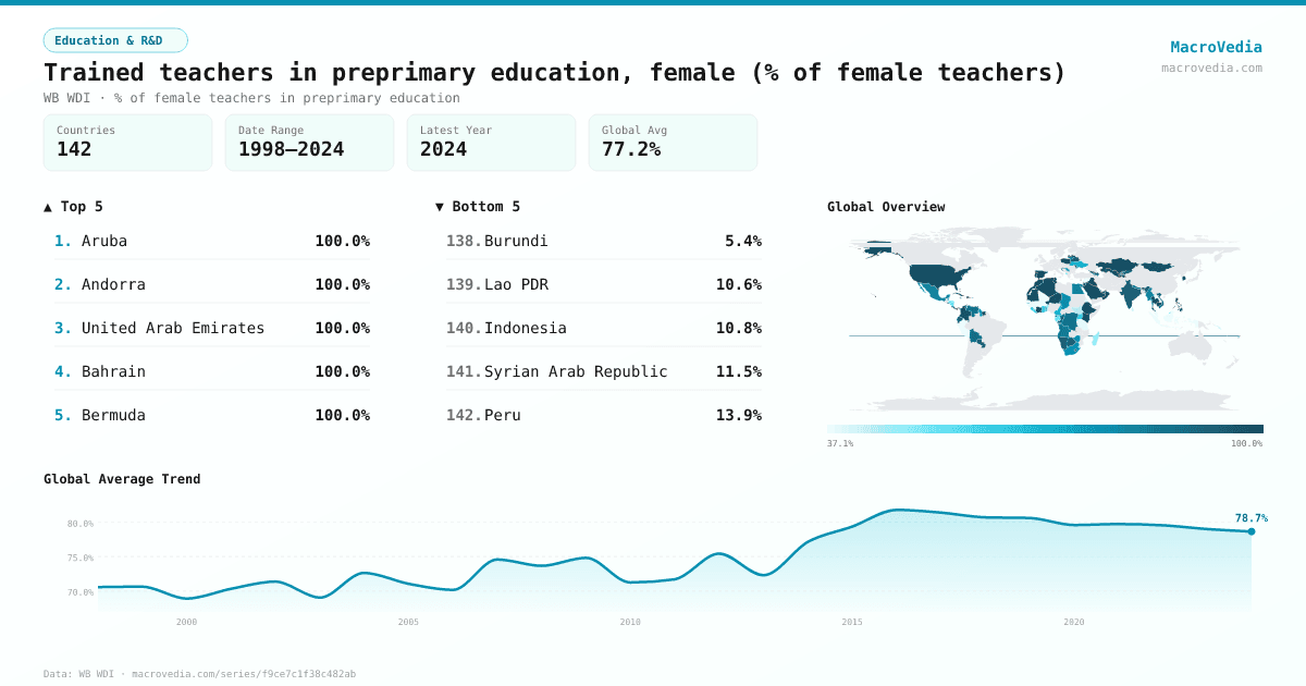 Education & R&DWB WDIwb_wdi:SE.PRE.TCAQ.FE.ZS•% of female teachers in preprimary education•1998 → 2024•142 countries