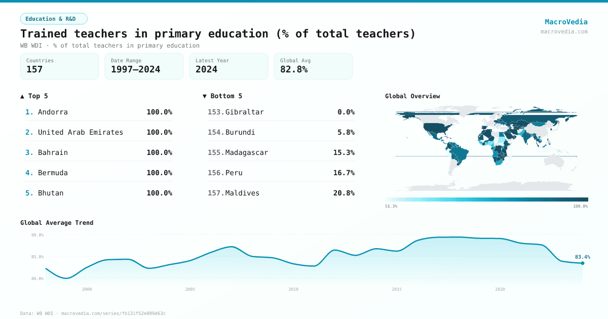 Education & R&DWB WDIwb_wdi:SE.PRM.TCAQ.ZS•% of total teachers in primary education•1997 → 2024•157 countries