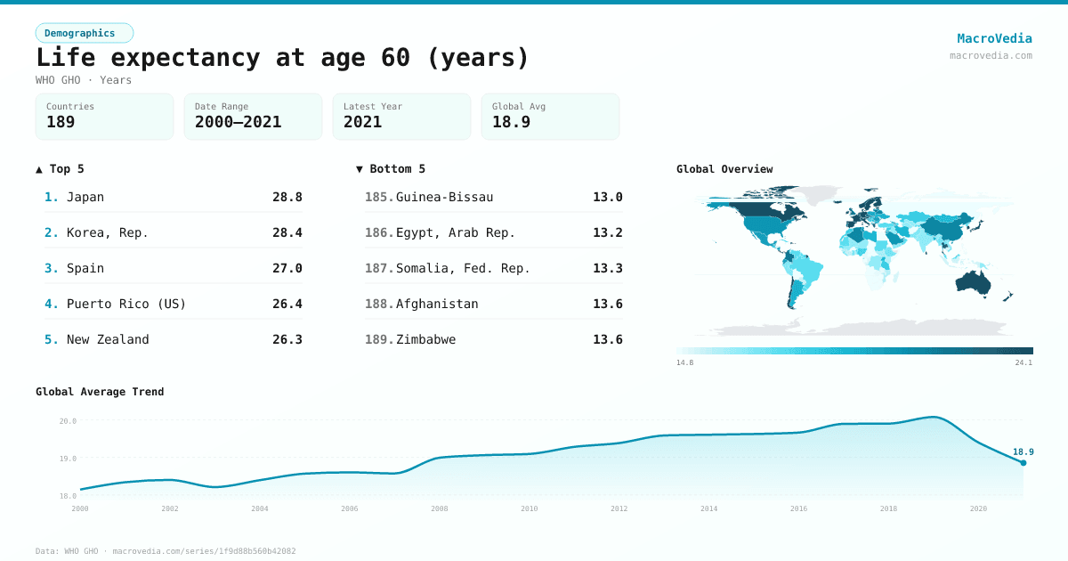 Life expectancy at age 60 (years) by country