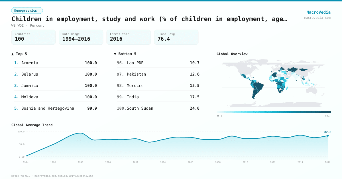 Children in employment, study and work (% of children in employment, ages 7- by country