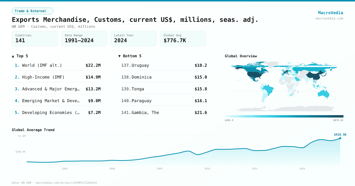 Trade & ExternalWB GEMwb_gem:DXGSRMRCHSACD•Customs, current US$, millions•1991 → 2024•126 countries