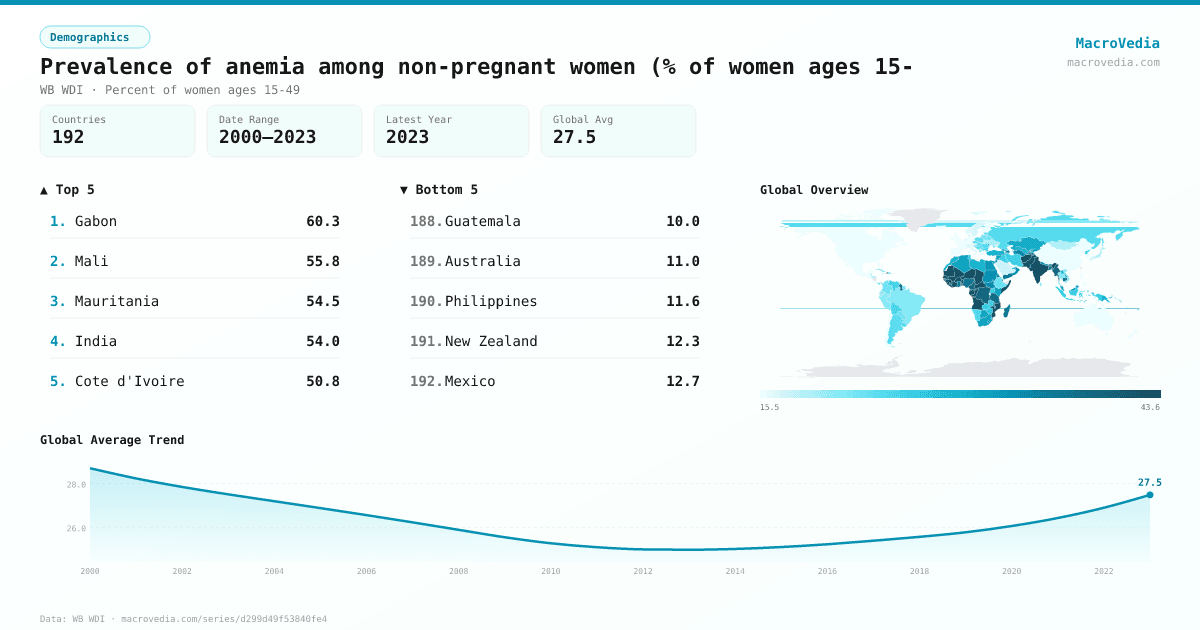 Prevalence of anemia among non-pregnant women (% of women ages 15- by country